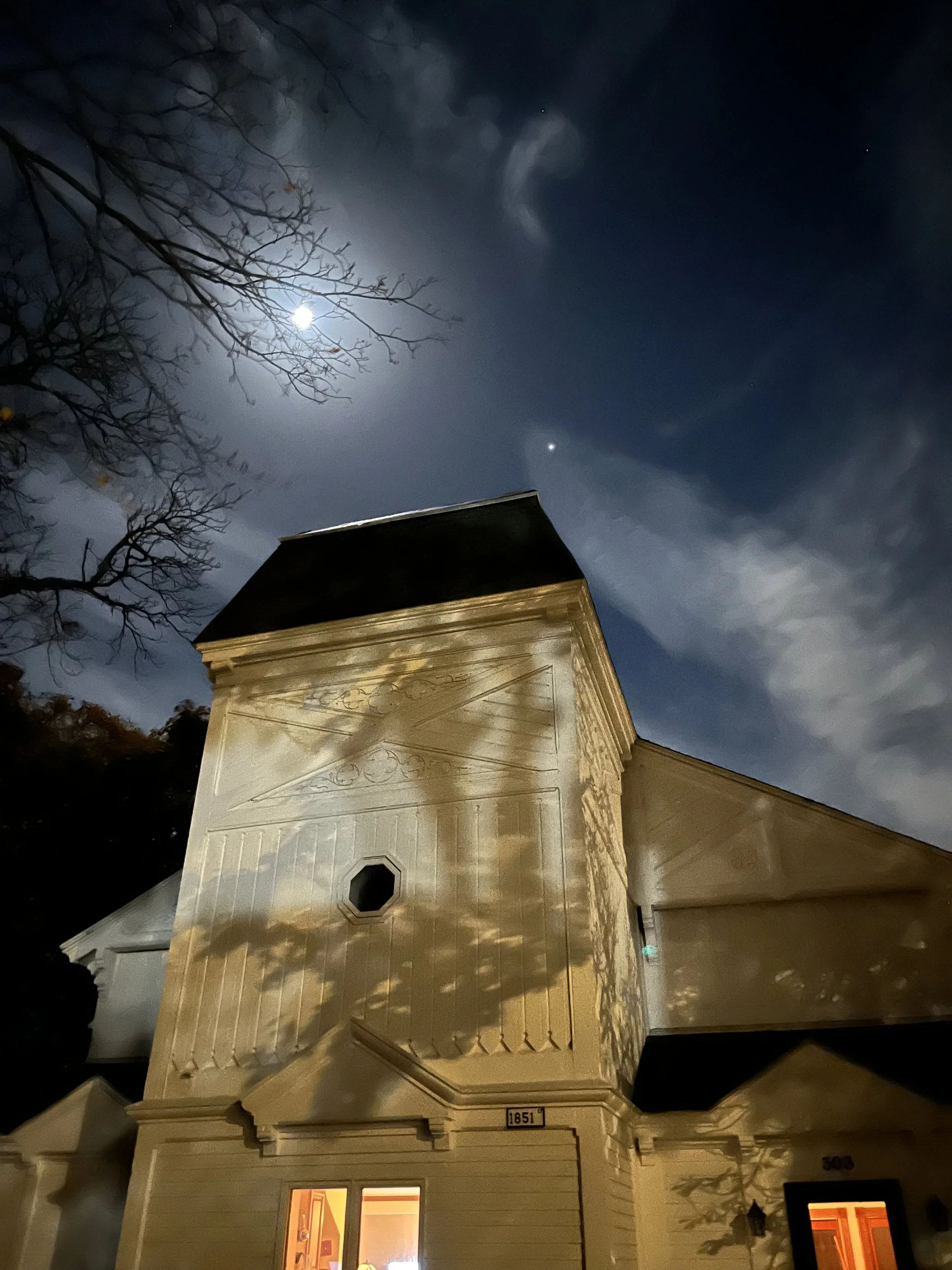 In 2023, tin church’s ceiling over the great room was replaced with the current coffered ceiling.